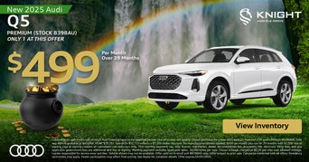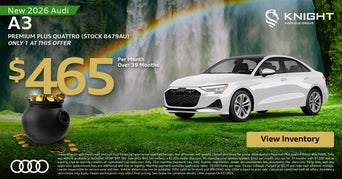 Lease offer on approved credit through Audi Financial Services for qualified lessees. Not all lessees will qualify. Closed-end lease for a new 2026 Audi Q3 S line Premium 45 quattro (Stock #8391AU). MSRP $43,045. Sale price $37,795 includes $2,750 dealer discount and $2,500 in manufacturer rebates; rebates subject to change and may not be available to all customers. $399 per month for 36 months with $6,000 due at signing. Due at signing consists of capitalized cost reduction only. First monthly payment, tax, title, license, registration, dealer documentation fee, acquisition fee, electronic filing fees, and any applicable government fees are additional and due at signing. Monthly payment excludes applicable taxes. 10,000 miles per year. Excess mileage charged at $0.20 per mile over allowed mileage. Lessee responsible for excess wear and tear. Vehicle shown may not be available. Offer subject to prior sale. Cannot be combined with all offers. Residency restrictions may apply. Dealer participation may affect final pricing. See dealer for complete details. Offer expires 02/02/2026.